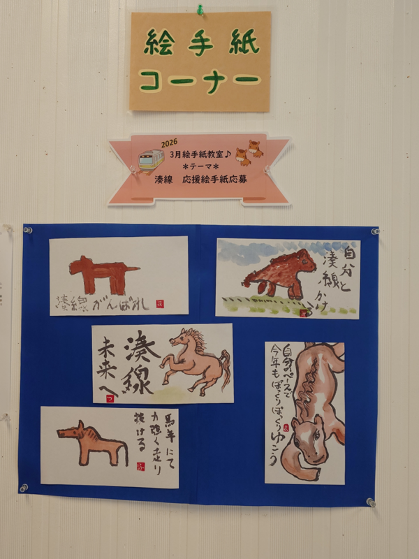 きらり 2026.04.03 絵手紙教室 以前皆さんが作った馬を絵手紙に描きました。 今回の絵手紙は【湊線 応援絵手紙】として応募します(^^)/ 応募した絵手紙は、5月下旬~9月下旬 すべての車両と駅に展示 10月にはJR勝田駅東口 winwinビル1階 コミニュティギャラリー展に展示 皆さんの絵手紙が旅をするようでワクワクします♪