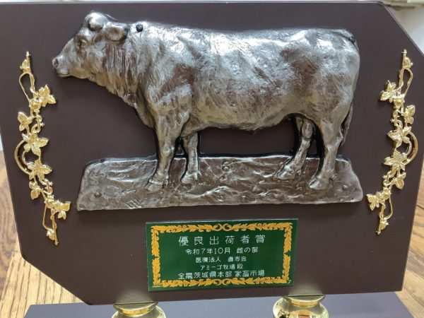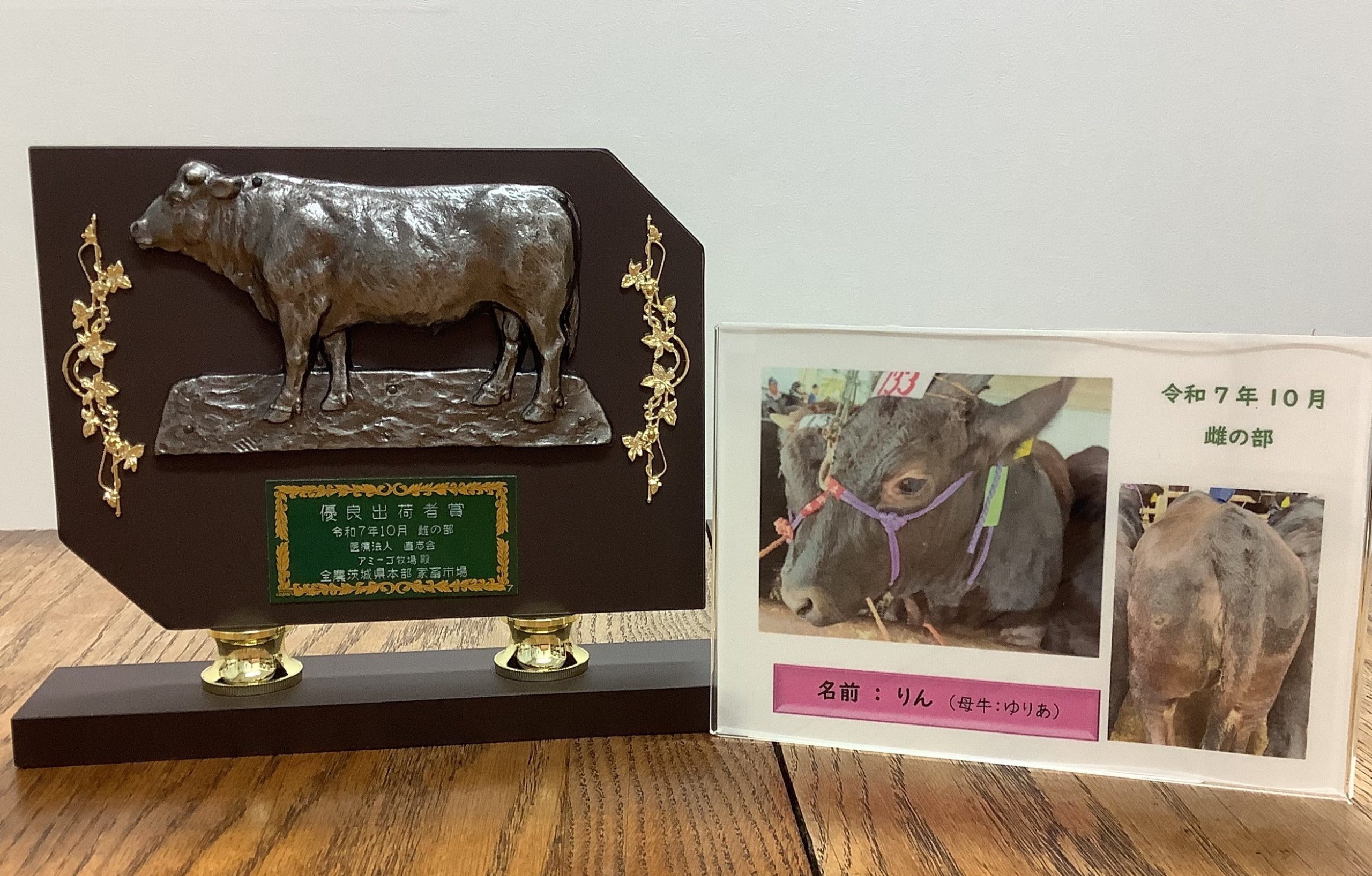 MINA AMIGO 2025.12.03 またもや、セリ市場で最高値を取りました。 おかげさまで、令和7年10月15日の常陸大宮セリ市場にて、アミーゴ牧場が出荷した「りん号」が、雌の部で市場最高値により、セリ落とされました。写真は最高値を記録した子牛の写真と、それを称える盾であります。 久しぶりの市場最高値であります。おかげさまで、アミーゴ牧場の子牛は市場でも高値で取引されるようになってきましたが、 最高値を付けたのは、3度目の栄誉であります。 これも、牛を単なる家畜としてではなく、命ある大切な存在として日々接して育てた成果であると確信しております。 私たちは、障害福祉サービス事業者であり、一般の畜産農家の皆様とは、ひと味違ってユニークで楽しみ、向き合いながら子牛を育てております。 これからも、利用者さんと一緒に、牛たちも私たちの“家族のように”育てていきたいと思います。