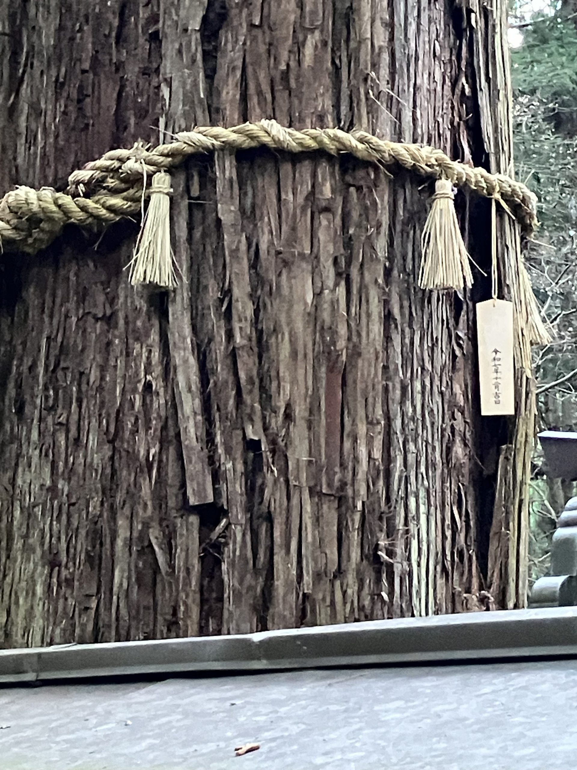 MINA AMIGO 2026.01.10 大注連縄を御岩神社様に奉納させていただきました。 先日行われたアートフェスタで作成して飾られたアミーゴの“大注連縄”を日立市の御岩神社様の境内、神様に一番近い、御垣内の杉の木に巻いていただいているようです。とても名誉なことであります。 アミーゴの注連縄作業は、御岩神社の皆様にご指導、ご支援いただき、ここまで成長してくることができました。 今年の初詣は、利用者さんと共に、御岩神社様に行って、感謝の気持ちを神様と神職の皆様にお伝えしてこようと思います。